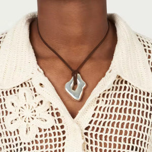 A modern statement with an artistic edge. The Abstract Wave Pendant features a fluid, sculptural design inspired by organic movement and natural flow. Suspended on an adjustable cord, this piece blends bold form with effortless wearability—perfect for styling alone or layering.
