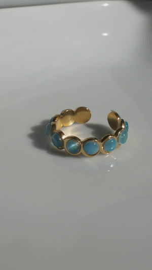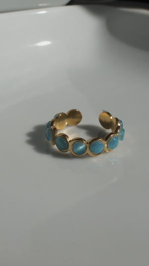 The Blue Mirage Ring blends soft ocean tones with a bold gold band for the perfect touch of dreamy elegance. Each oval stone catches the light beautifully, giving a glowing, water-like shimmer that elevates any stack. Adjustable, lightweight, and made for everyday wear.