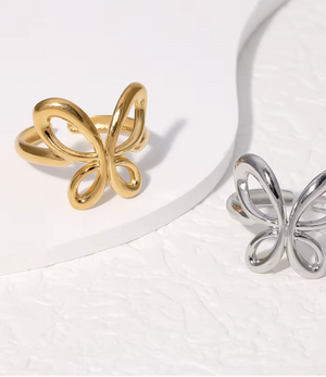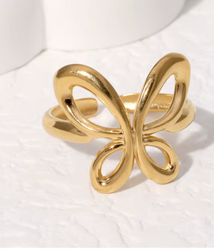 The Butterfly Kiss Ring is where dainty meets divine. This gold-plated beauty features a delicate butterfly design kissed with sparkle—just enough to catch the light (and some stares). Whether you’re dressing up or keeping it casual, it adds a flirty, feminine flair to every look.