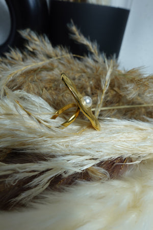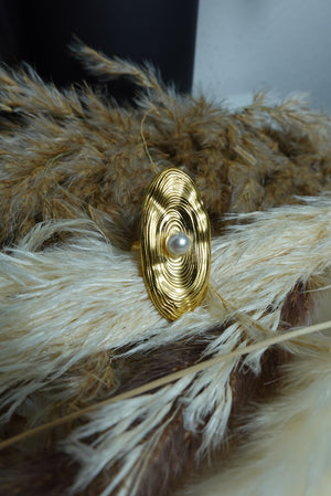 Artful and timeless. The Echo Ring features a long, oval silhouette with textured ripple detailing that draws the eye inward to a single pearl at the center. It’s a quiet statement—elegant, earthy, and effortlessly elevated.