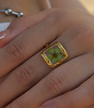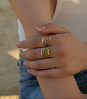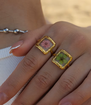 The Flora Ring brings natural charm to your jewelry stack, featuring a crystal-clear, floral-detailed center stone wrapped in organic gold framing. Available in two soft, spring-inspired tones—rosé pink and olive green—it’s your perfect everyday pop of color with a vintage twist.