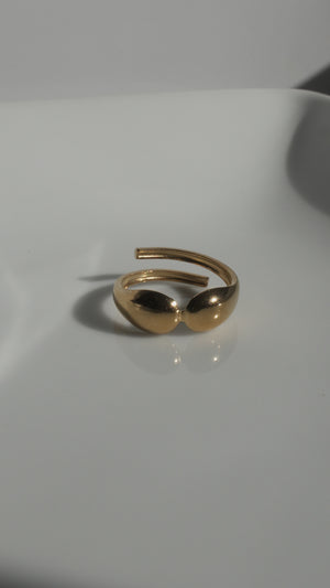 The Golden Droplet Ring features two smooth, rounded drops that meet at the center of a sleek wrap band. Its minimalist, modern design gives a soft yet bold touch—perfect for stacking or wearing solo for an effortless, polished look. Lightweight, adjustable, and made for everyday shine.