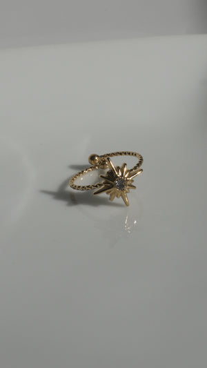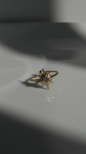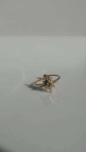 The Golden Nova Ring shines with a radiant starburst design centered around a brilliant crystal. Its twisted band adds a delicate touch while the bold star detail brings the perfect amount of sparkle. A dainty celestial piece made to elevate any everyday look.