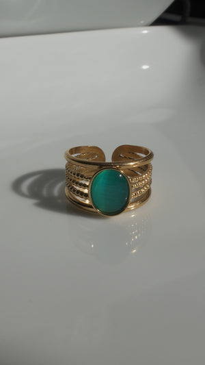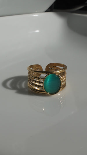 The Green Goddess Band is a bold, elegant statement piece featuring a deep emerald-green stone set on a textured gold band. Its layered detailing gives a luxury feel, while the rich color adds a touch of power and softness all in one. Adjustable, comfortable, and made for everyday shine.