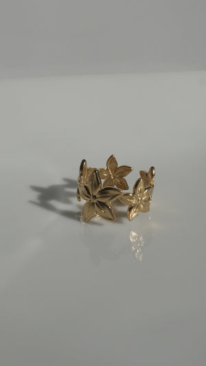 The Floral Harmony Ring features a band of sculpted gold flowers that wrap beautifully around the finger, creating the perfect blend of softness and elegance. Its delicate design adds a romantic touch to any look—whether worn alone or paired with your favorite stack. Adjustable and made for everyday shine.