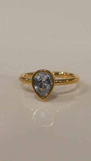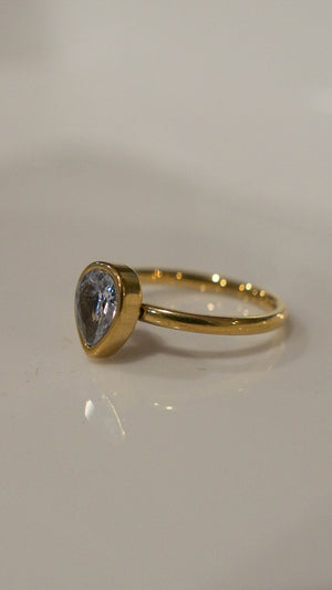 A minimal yet stylish gold band featuring a brilliant pear-shaped (teardrop) clear gem set in a smooth, modern bezel setting. This sleek design secures the stone while creating a clean, sophisticated line. Lightweight and perfect for stacking or wearing alone as a refined statement. Crafted with high-quality stainless steel so it stays shiny, water-safe, and tarnish-free for everyday wear.