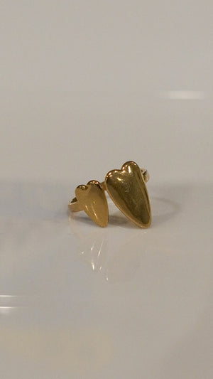 A minimal yet stylish gold ring featuring two smooth, polished heart charms—one slightly larger than the other—that sit side-by-side on an open band. The hearts are beautifully domed, catching the light for a high-shine, modern look. This piece symbolizes a beautiful connection, offering a contemporary take on a classic sentimental motif. Lightweight, adjustable, and perfect for everyday wear. Crafted with high-quality stainless steel so it stays shiny, water-safe, and tarnish-free for everyday wear.