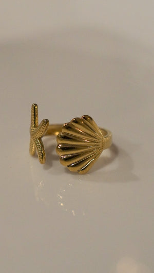A minimal yet stylish gold ring featuring an open-ended cuff design, adorned with two distinct nautical charms: a textured starfish and a detailed, fluted scallop shell. This piece captures the effortless elegance of the coast and is perfect for adding a touch of summer to your look year-round. Lightweight, adjustable, and designed for easy, everyday wear. Crafted with high-quality stainless steel so it stays shiny, water-safe, and tarnish-free for everyday wear.