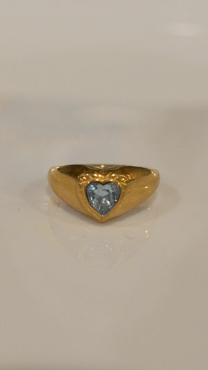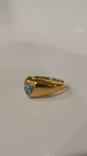 A minimal yet stylish gold ring featuring a chunky, domed signet-style band that tapers to a sleek underside. The face showcases a brilliant, light blue heart-shaped gem set within a secure, custom bezel. This bold piece is vintage-inspired, offering a unique blend of modern chunky style and timeless romance. Crafted with high-quality stainless steel so it stays shiny, water-safe, and tarnish-free for everyday wear.