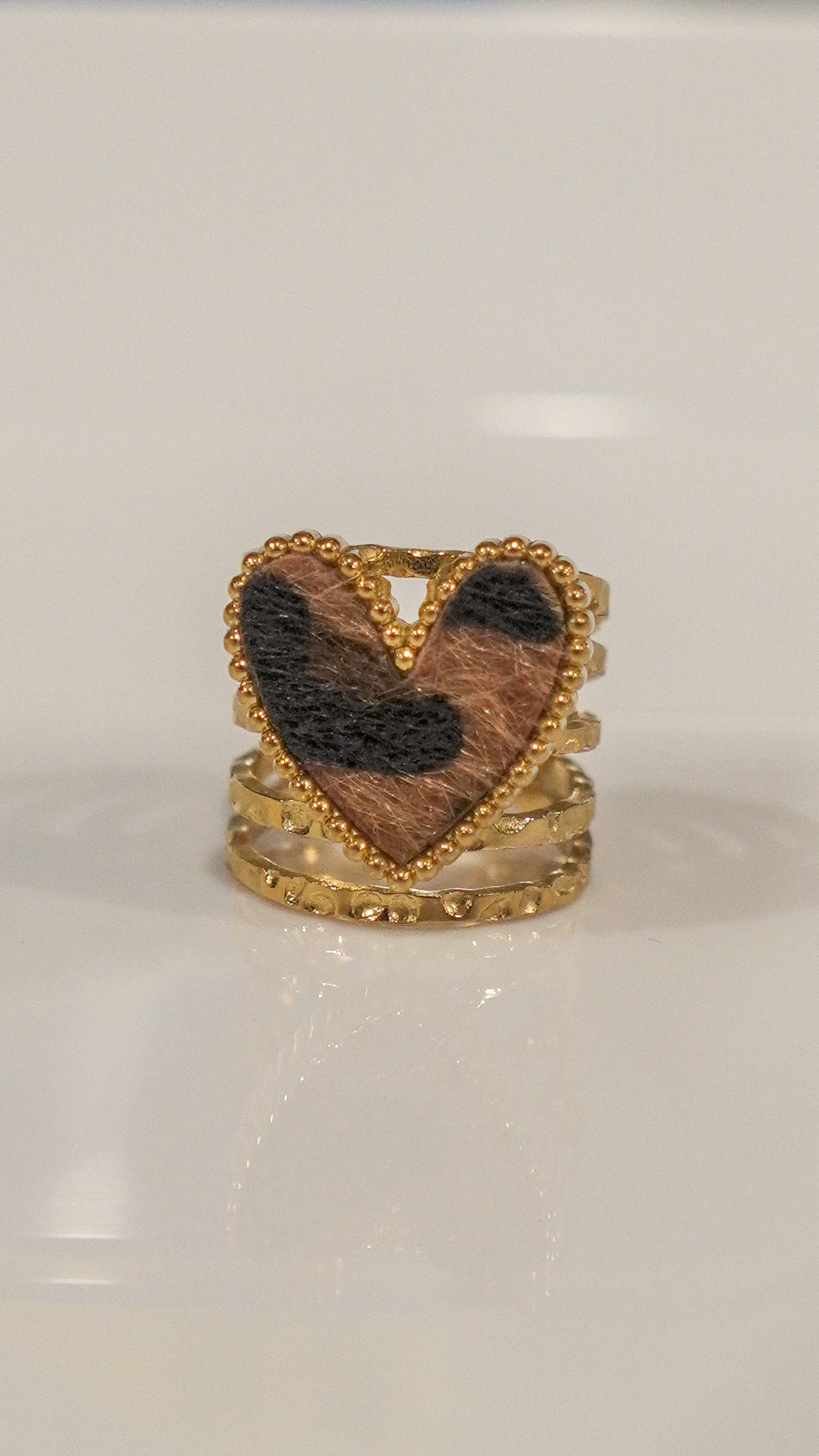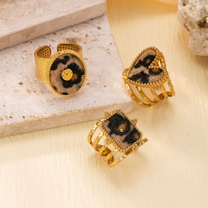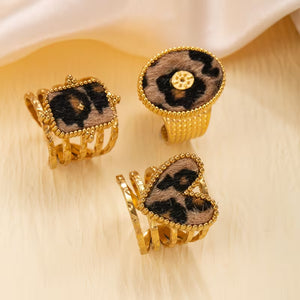 Elevate your stack with our 3-piece gold ring set, featuring an eye-catching animal print band and two polished shape rings in oval, heart, and rectangle styles. Wear them together for a bold, layered look — or purchase them individually to style your favorites. Lightweight, shiny, and perfect for everyday glam.